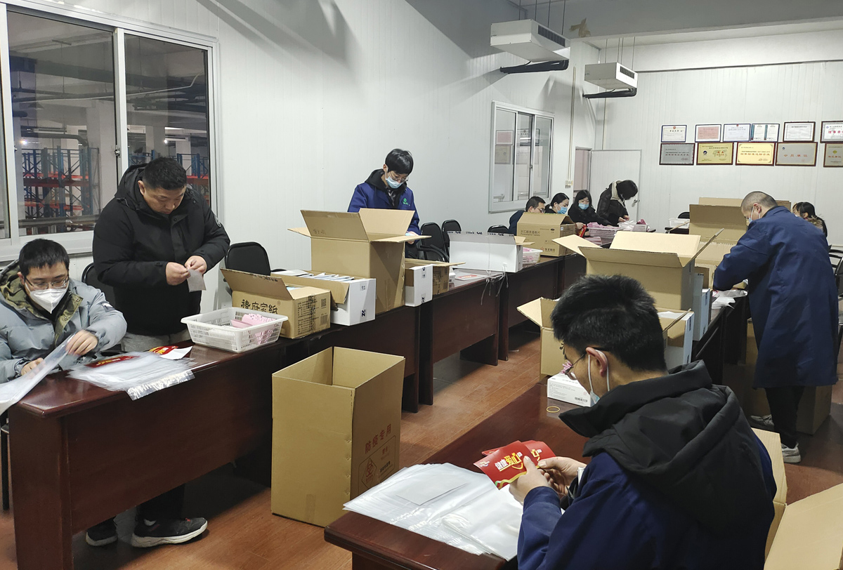 為及時(shí)將“健康愛心包”送到全區(qū)老年人手里,為他們送上一份寒冬里的防疫保障,公司全體員工紛紛投入到愛心包的生產(chǎn)和包裝制作中來。